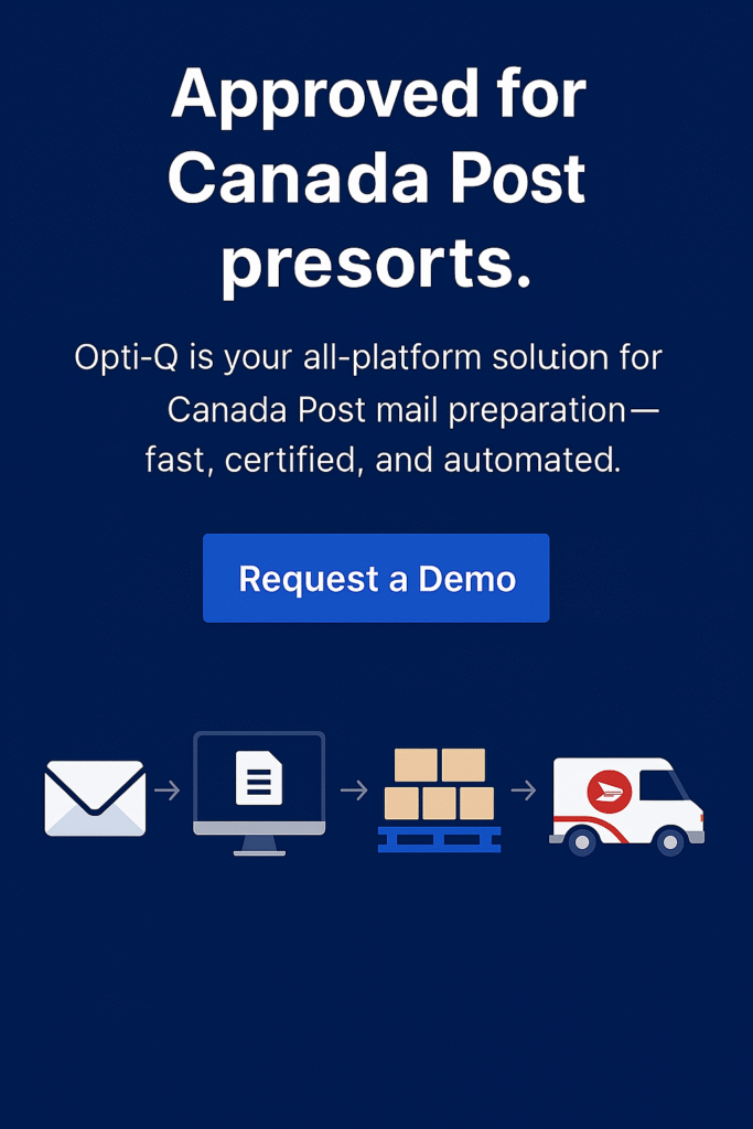 - All reports and labels required – Run Opti-Q, prepare mail, send to Canada Post and save $$$.